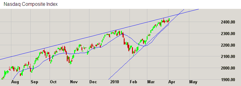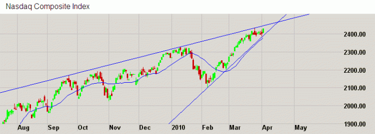 We may be in for a similar scenario now. The recent rally is getting long in the tooth, and both Nasdaq and Dow Jones index are only just below overhead resistance from a long term trend line.