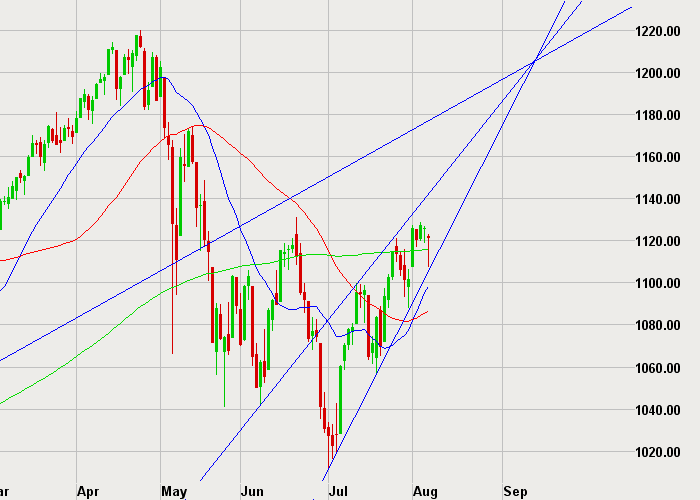 As you can see, the S&P 500 is barely holding above the up trend line that started in early July. With the next Red Period looming we could easily break down, which would probably see us to 1060-1080 pretty quickly.