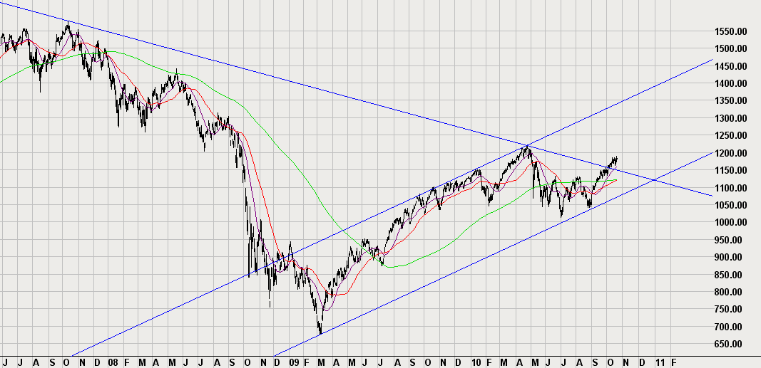 Resistance levels at 1130 and 1165 were taken out very easily in the recent weeks. Now the only remaining hurdle for the S&P is the 1220 level, the recent April highs. If that level is broken decisively to the upside, then things open up towards 1300 and even 1400, where we would run into the upper boundary of a long term up trend channel.