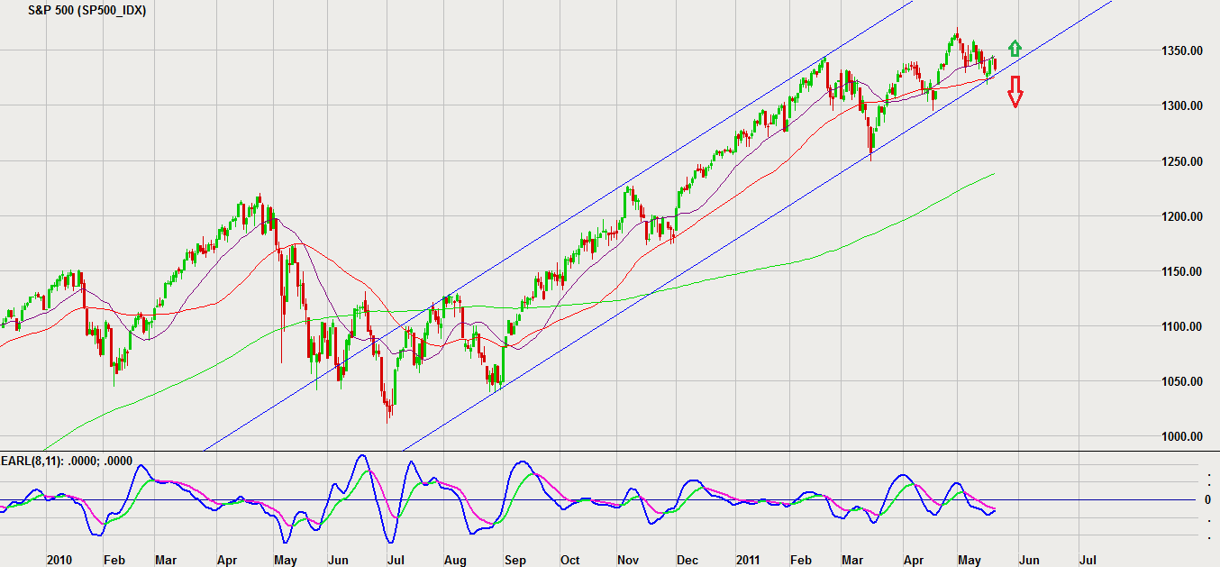 The market has dropped right to its long term support trendline. The trend is still intact, but any further drop from these levels will put the uptrend in serious question. Two closes below 1320 or a move below 1300, would be a signal for me to leave this market, despite the fact that we are in a Green Period. There is just too much risk for a sizeable drop here, given that the S&P is up 30% since last summer.