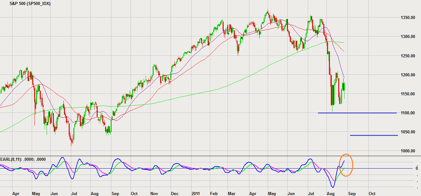 Market action has not been convincing since the early August drop. The next lunar Red Period could easily take us back to retest the lows. My Earl momentum indicator also appears to come close to signalling a short term top. Current S&P500 targets are 1100 and then 1040.