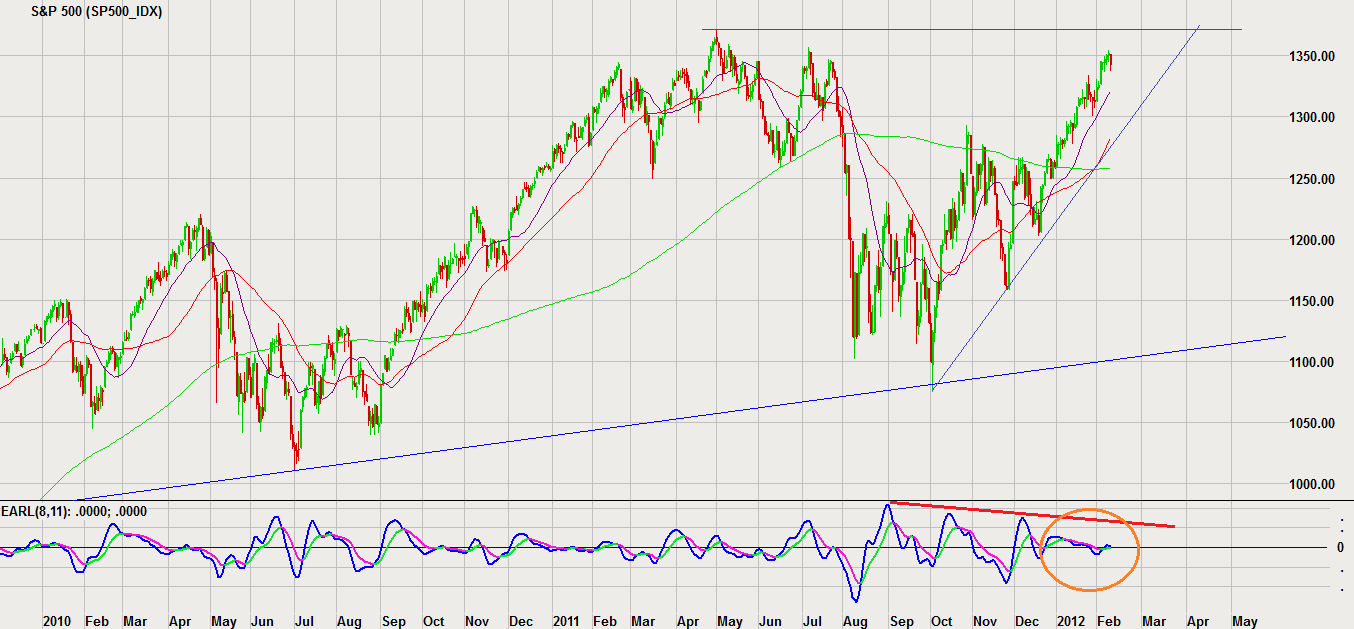 The S&P is coming close to last year’s highs @1370, so that may be reached in the next couple of weeks. But my Earl indicator is signalling weakness ahead, so I think we are going to make a short term top here.