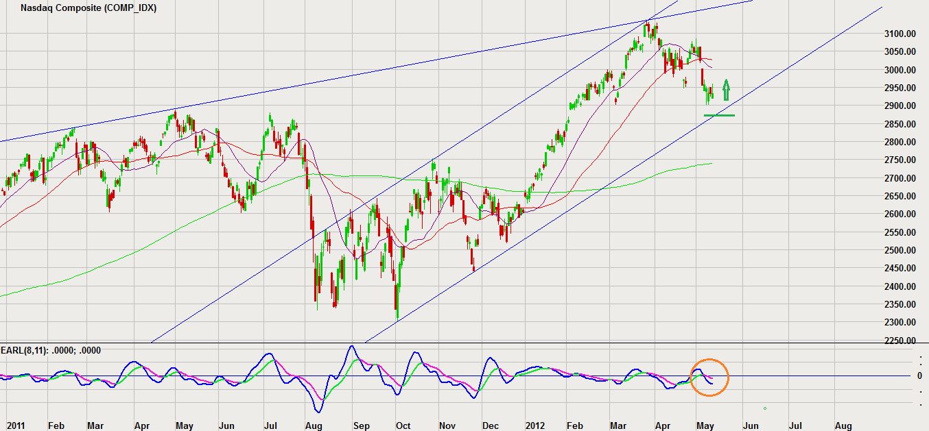 The Earl indicator is based on a proprietary formula and is designed to be “early”. It often bottoms (or peaks) right when the market does so, and sometimes even a couple of days/weeks before the market does so. So whenever the Earl turns upwards from a bottom, I get ready to buy. It is also useful to confirm the trend we expect from our lunar cycles, and that’s how we use it here on the weekly blog.