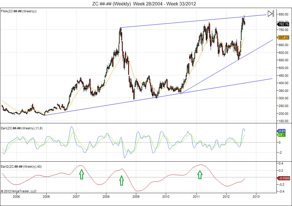 For our chart of week, we take a look at Corn, which has gone to record highs recently. This is a long term weekly chart (click for larger image):