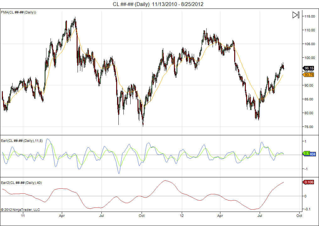 As you can see the Earl2 is now coming into the regions where we start looking for a top. Meanwhile the shorter term Earl (blue line) is showing weakness and turning down already. This usually means that a correction is impending. If oil (CL) drops below $94 , then $85 would become my next target.