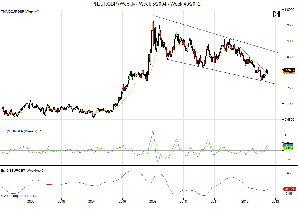 This is a long term weekly chart. The Euro has been weakening against the Pound since early 2009.