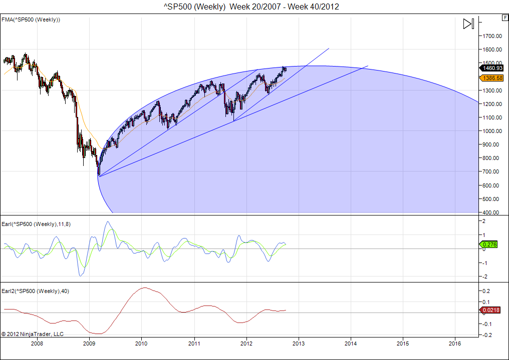 Meanwhile my Earl indicator (blue line) is just turning down, giving a sell signal. The slower Earl2 is barely holding above zero, also suggesting weakness. This means we probably need a downswing before we can try the upside again (likely in early 2013).