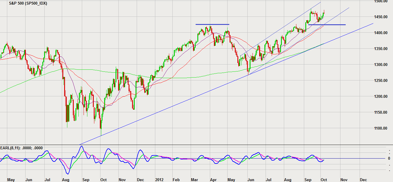 Since the 2009 lows, the market action in the S&P 500 index has been capped by a large ellipse, with multiple touches. As long as the market doesn’t break decisively out of this pattern, we have to consider it valid. This means that the 1470 level could continue to form major resistance for the next year or so.
