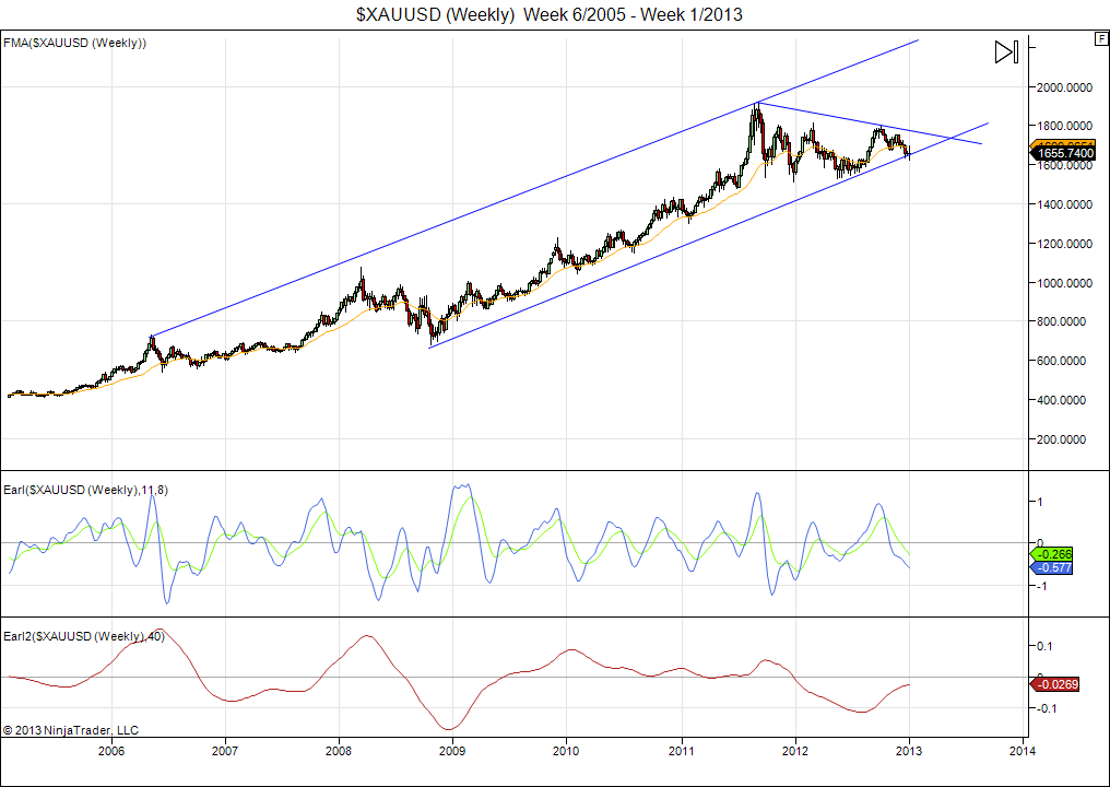 This is a longer term weekly chart. The setup shows good potential to start a rally that would take gold above $2000/ ounce. But a failure to do so pretty soon would probably signal the end of the multi year rise in gold prices.