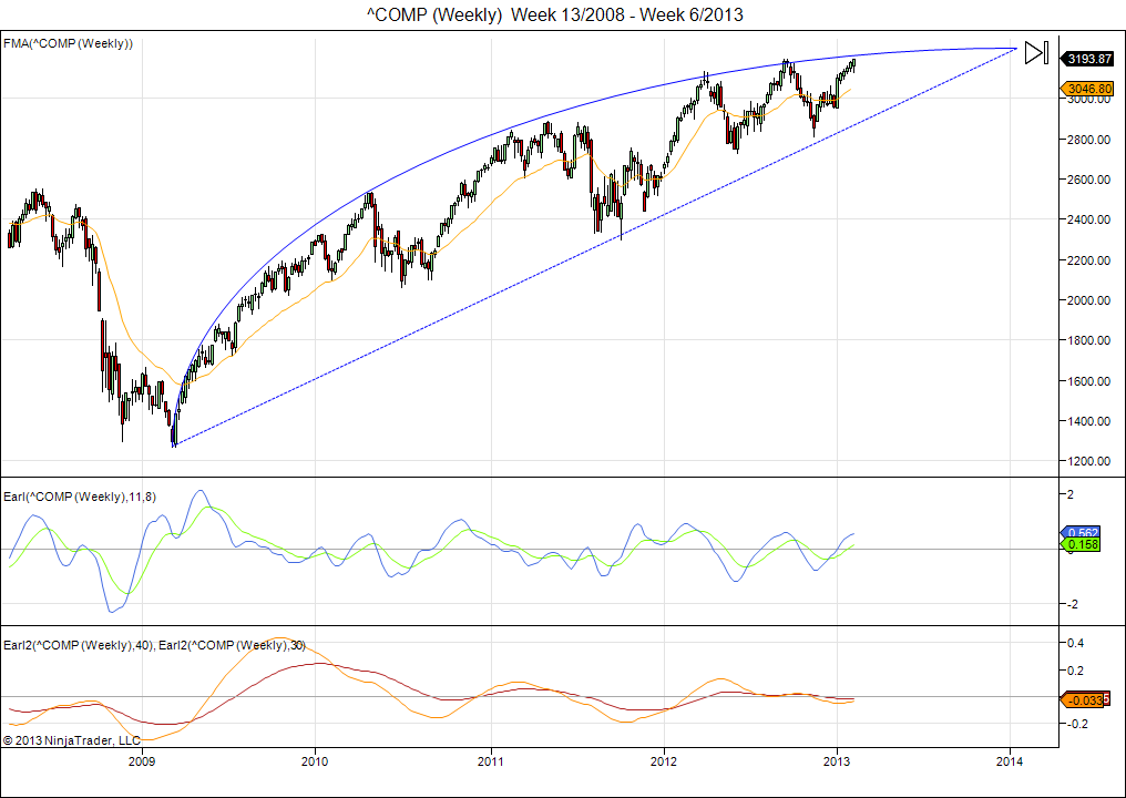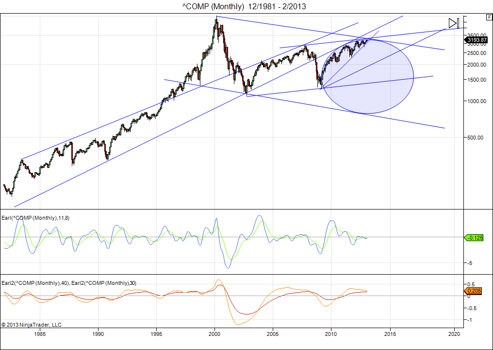 Since the early 2009 bottom, the Nasdaq price action has been contained under a large arc formation, with multiple touches. This indicates a gradually weakening momentum. The arc formation converges around 3300 by the end of the year. This tells us that the 3200-3300 area is going to offer tough resistance. It also means that the market will probably make some important breakout, up or down, before the end of 2013.