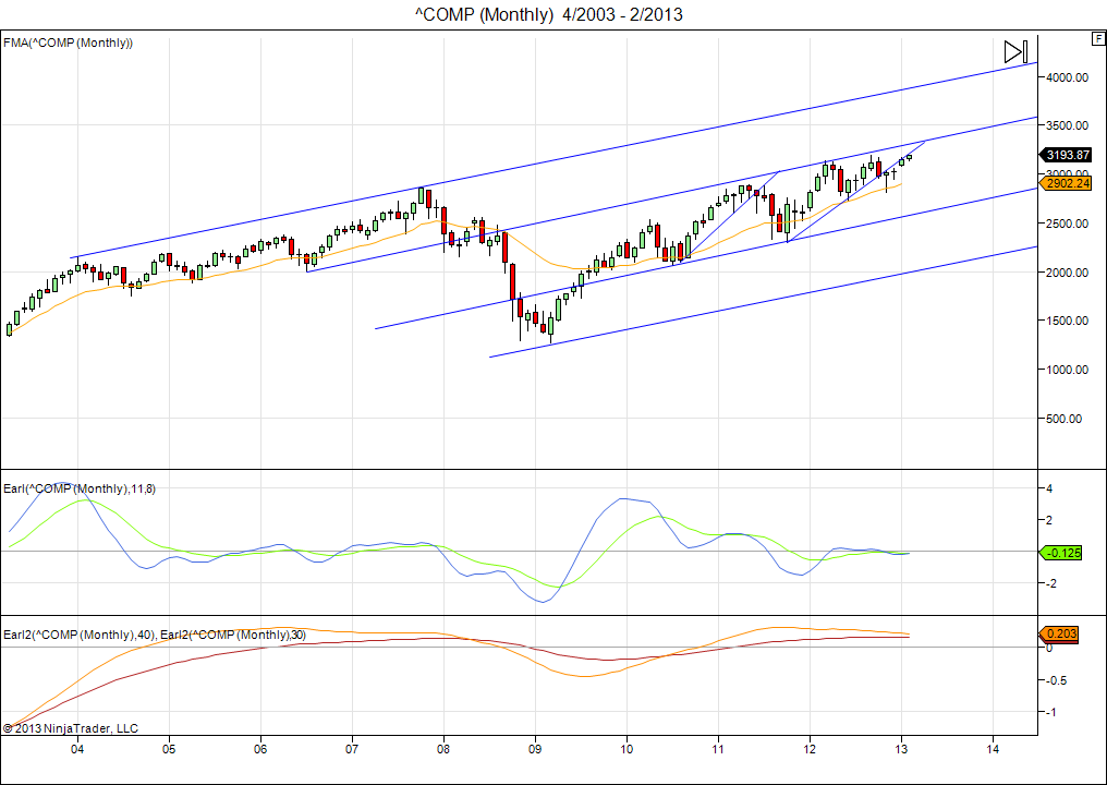 Now that the markets we cover have reached important upside targets, it is a good moment to take a look at the longer term picture. Here are some long term charts for the Nasdaq Composite index.