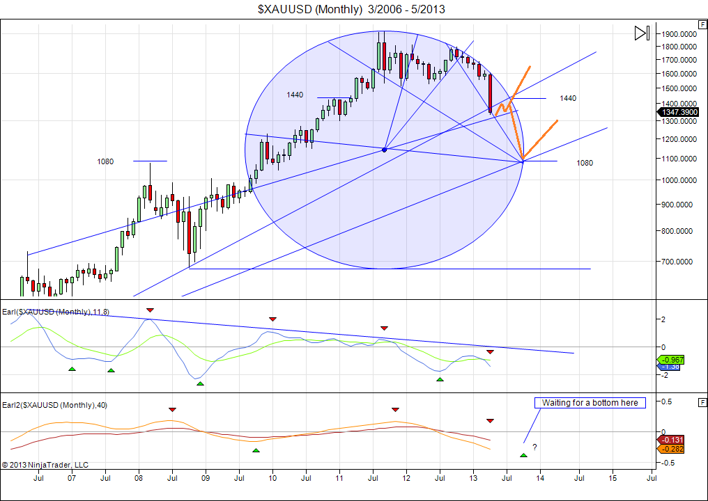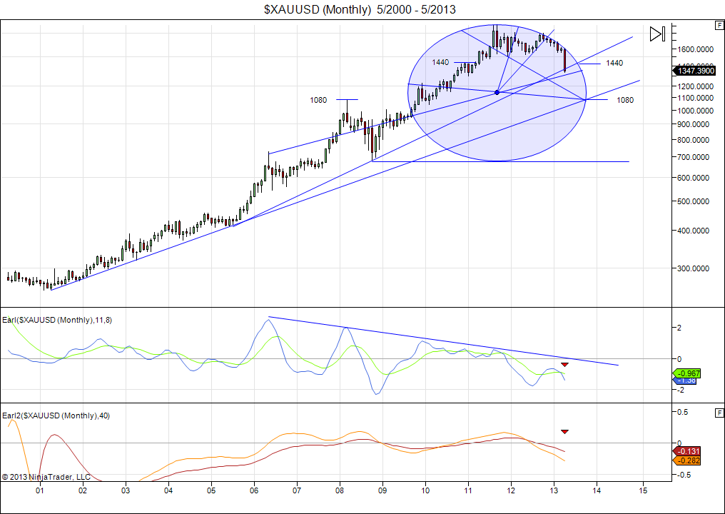 Even on the daily chart, gold has dropped from $1560 to $1330 within two days, which also puts the biggest rate of change point at $1445. This points to an ultimate low just below $1100.