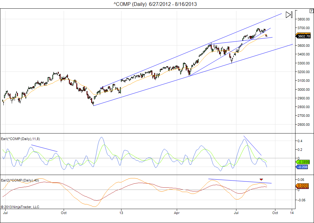 While the market could continue to hover around current levels for a while, I don’t think this correction is over. This decline has started with several bearish divergences in my Earl indicators, which usually means a larger correction is in the pipeline. It is very similar to the situation we saw in September 2012.