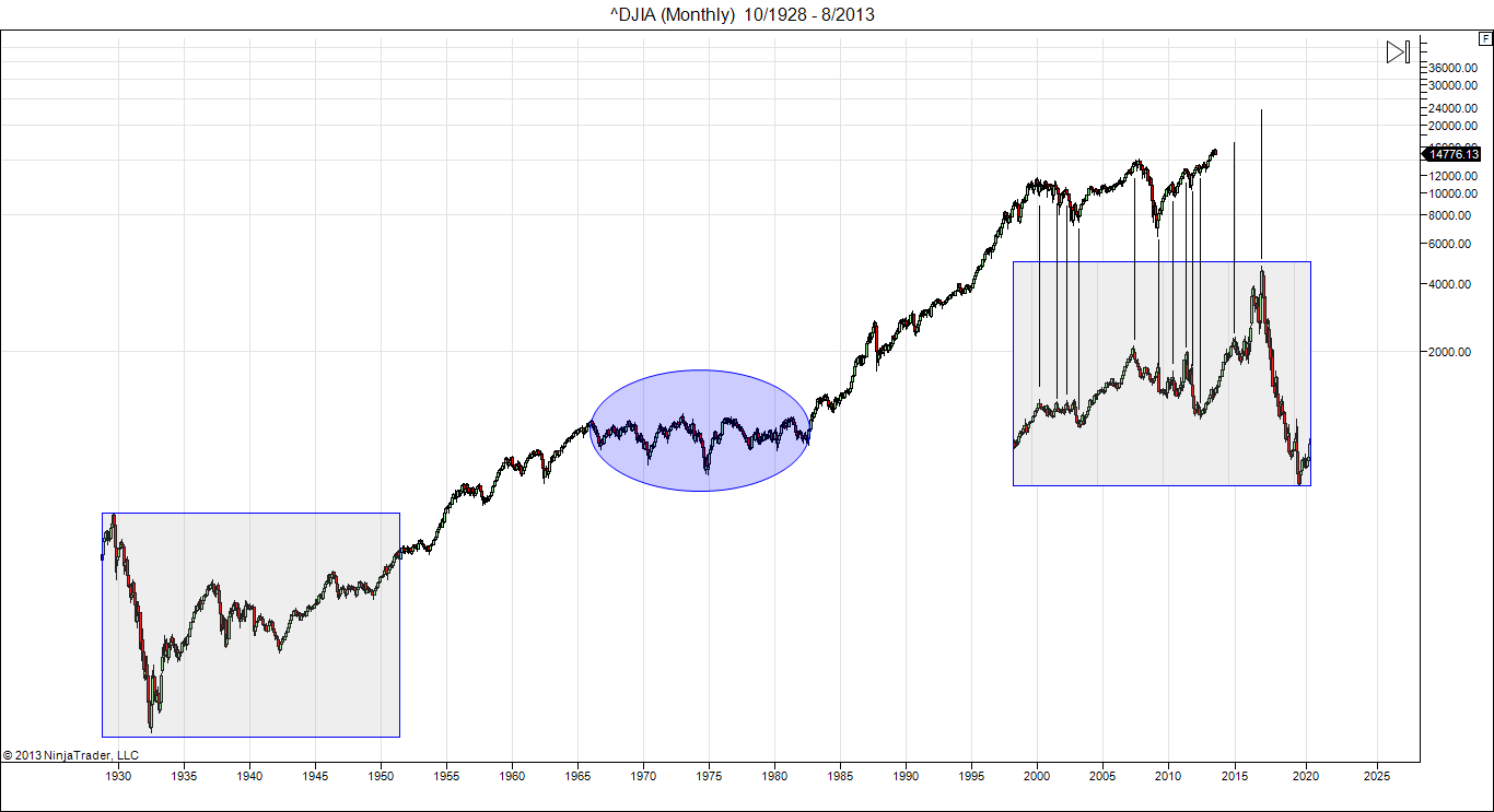 If you look at a long term chart of the Dow Jones Industrials it is interesting to see how symmetrical the advance since the 1932 depression lows has been.