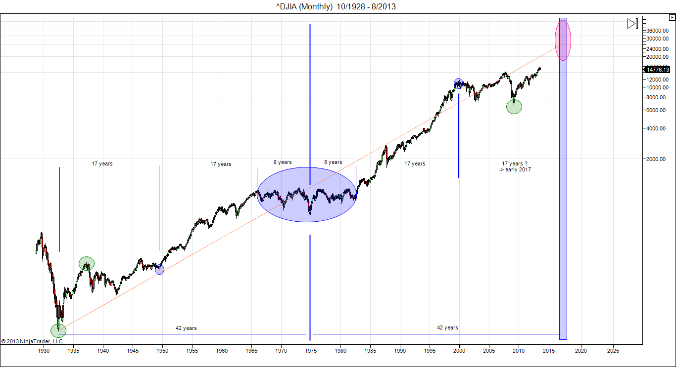 If the symmetry continues then the price action since the year 2000 peak should resemble the price action of the first 17 years since 1932, but mirrored. In the next chart I have done that exercise (click for larger image):