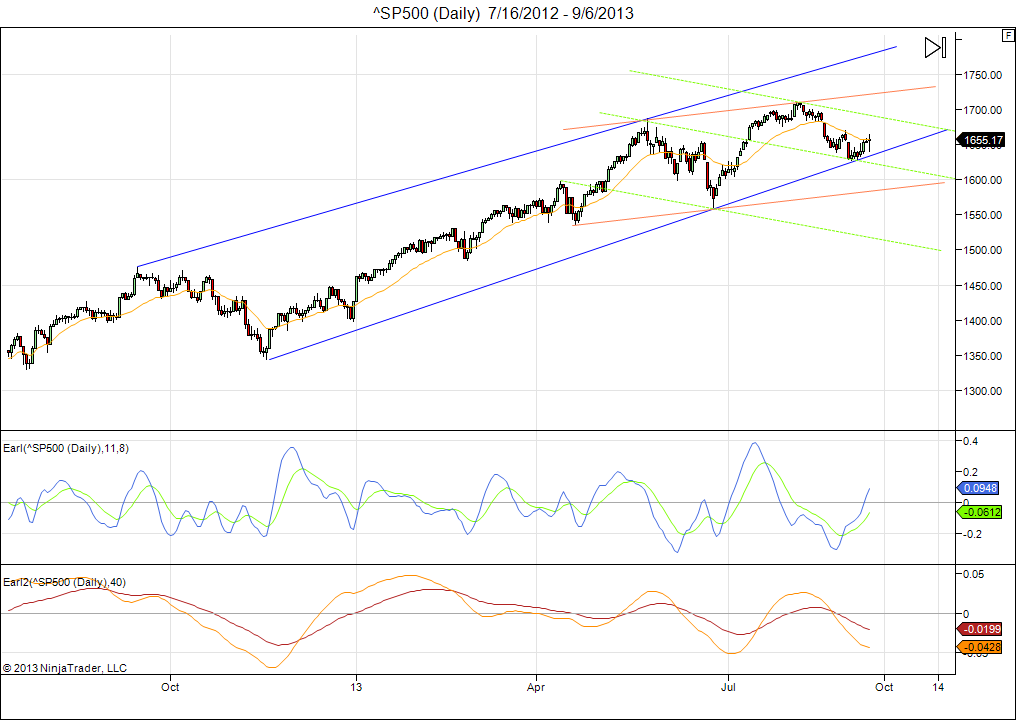 Technically we see that the Earl indicator has climbed back above zero, but the slower Earl2 is still going down. This means there is room for another dip lower. Likely downside targets are now just below 1600, and around 1500 if we get a more serious drop.