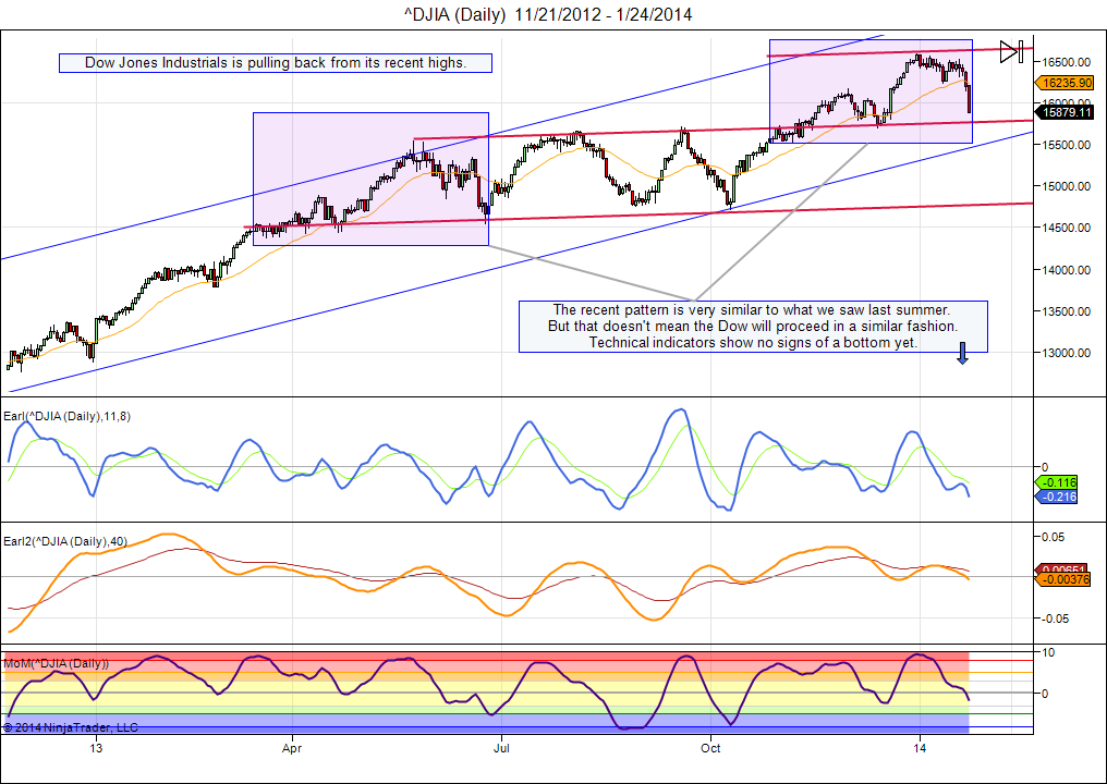 Six stocks have gone bearish last week, leaving now only 17 Dow Industrials stocks with a bullish setup on the weekly level. This is the lowest number of bullish stocks since December 2012. We got several pullbacks in 2013, but the number of bullish stocks in the Dow never dropped below 20. The current downturn appears to be of a more serious nature. The market will have to turn up really quickly, otherwise we will soon have more bearish stocks in the Dow than bullish ones, and that would imply the start of a bigger correction.
