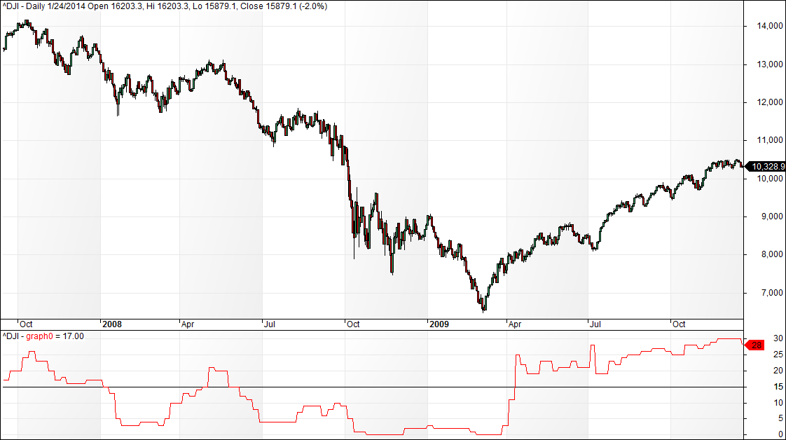 As the market started going down from record highs in 2007, the number of bullish stocks quickly fell below 20, and by early 2008 it dropped below 15. So, that was a clear sign to get out. It briefly rose back above 20 in May 2008, so one would have bought at that point. But that didn’t last long and soon the number of bullish stocks was back below 15, so out of the market again. In April 2009 the number of bullish stocks rose back above 20, and this proved to be a more profitable buy signal.