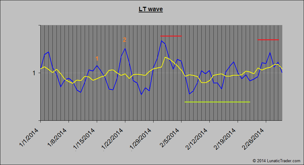 The LT wave did well in January as it correctly indicated a weak month. Actually, the S&P 500 reached its high for the month on January 15th, while the Nasdaq reached a high on the 22nd. These two dates showed up as peaks in our LT wave chart (marked with “1” and “2” here). Obviously, it doesn’t always work that well, but it’s nice when it does.