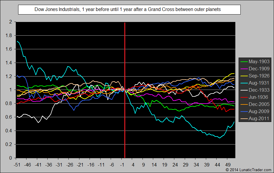A grand cross (GC) only happens a handful of times per century if we consider the outer planets (Mars to Pluto) with a 10 degree orb. I looked into all examples since the start of the 20th century, focusing on the two year period centered around the month when the GC becomes most exact. Doing this we can easily see what happened in the market (Dow Jones Industrials) from one year before the GC until one year after. Do we see a market reaction to this aspect? Does the market go up or down from it? Here is the result (click for larger image):