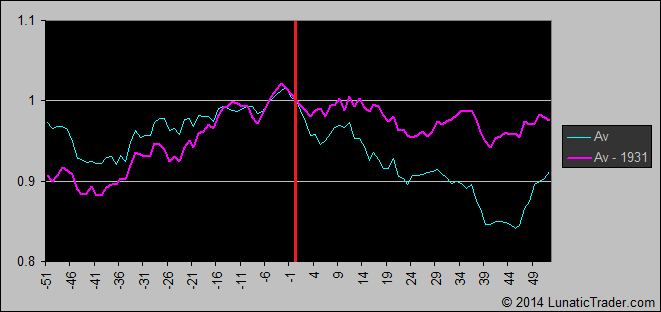 The blue line is the average of all samples, the magenta line is the average excluding the 1931 sample, which is a clear statistical outlier. Here we do see a general tendency for the market to rise until a few weeks before the GC is most exact. In the year after a GC the market tends to experience some weakness, with the average bottom coming 6 or 10 months after the GC data. In the current case that would point to a bottom in late October or in February 2015. Of course, because we have a sample of only 9 cases in the modern market era, the statistical confidence is very weak. I also checked the grand crosses that happened in the 19th century (5 cases), and the results were equally mixed.