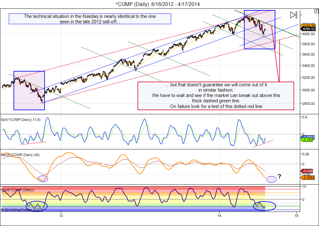 The recent price action in the Nasdaq is very similar to the sell-off we got in late 2012. And we are getting an identical setup in all my technical indicators. Bullish divergences are appearing in the Earl indicator while the slower Earl2 appears close to a major bottom. Meanwhile my MoM momentum indicator is forming a series of lows in very oversold territory, just like it did in 2012. So, history is ready to rhyme, right?