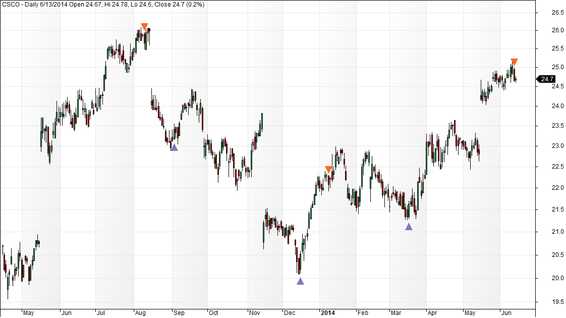 Also can be used on individual stocks. Here is a nice example for Cisco (CSCO):