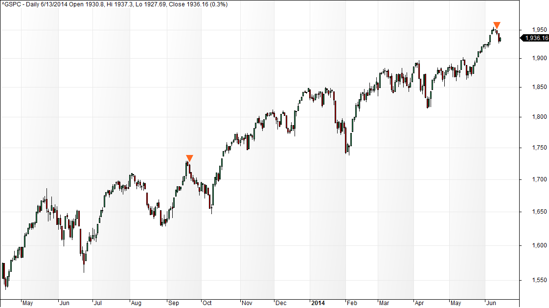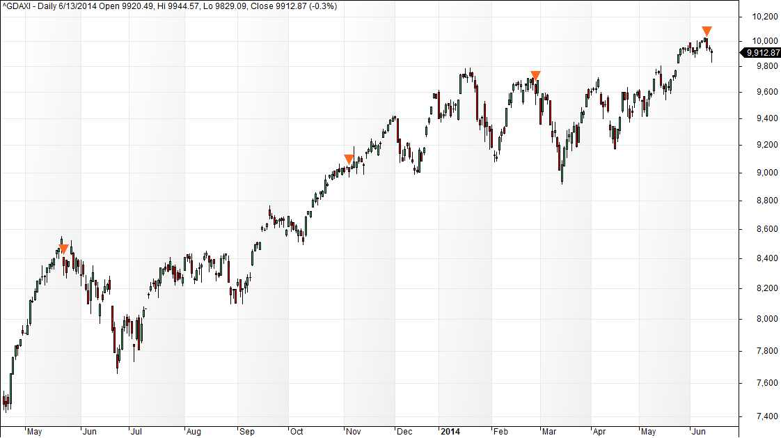 This week I also want to share an interesting concept that caught my attention thanks to Kora Reddy of Paststat.com, who posted the idea on Scutify. In a nutshell, we watch out for long sequences of days where a given market fails to close below the previous day’s low. If this happens for weeks on end it means the bears are too weak to push the market lower and also close it lower. Every dip is being bought and the market just continues up and up. Eventually this comes to end when the market does produce a close that is below the previous day’s low and that’s when we get an interesting signal. Last Wednesday this happened for the S&P 500, when a series of 17 days without a “close < previous day’s low” came to an end. The same happened for the Nasdaq on Thursday (after 18 days).