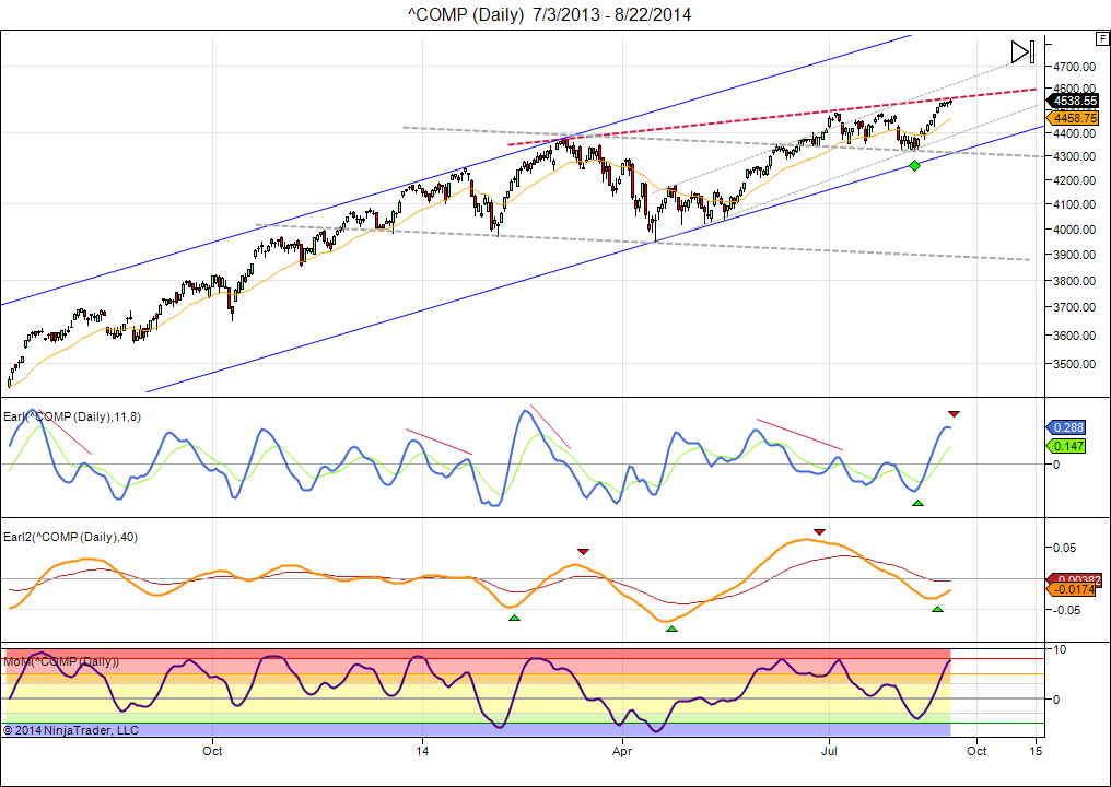 So, here we are at 4530. The Nasdaq is bumping into an overhead trend line. The lunar Green period is set to end later this week. Sell quick? Hmmm, maybe.