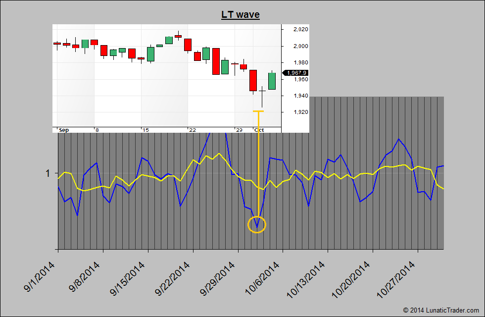 2. The LT wave doesn’t take any input from the market itself. That’s why it can be calculated months and even years into the future. In next version of LunaticTrader program the LT wave will be available for the next 100 years.