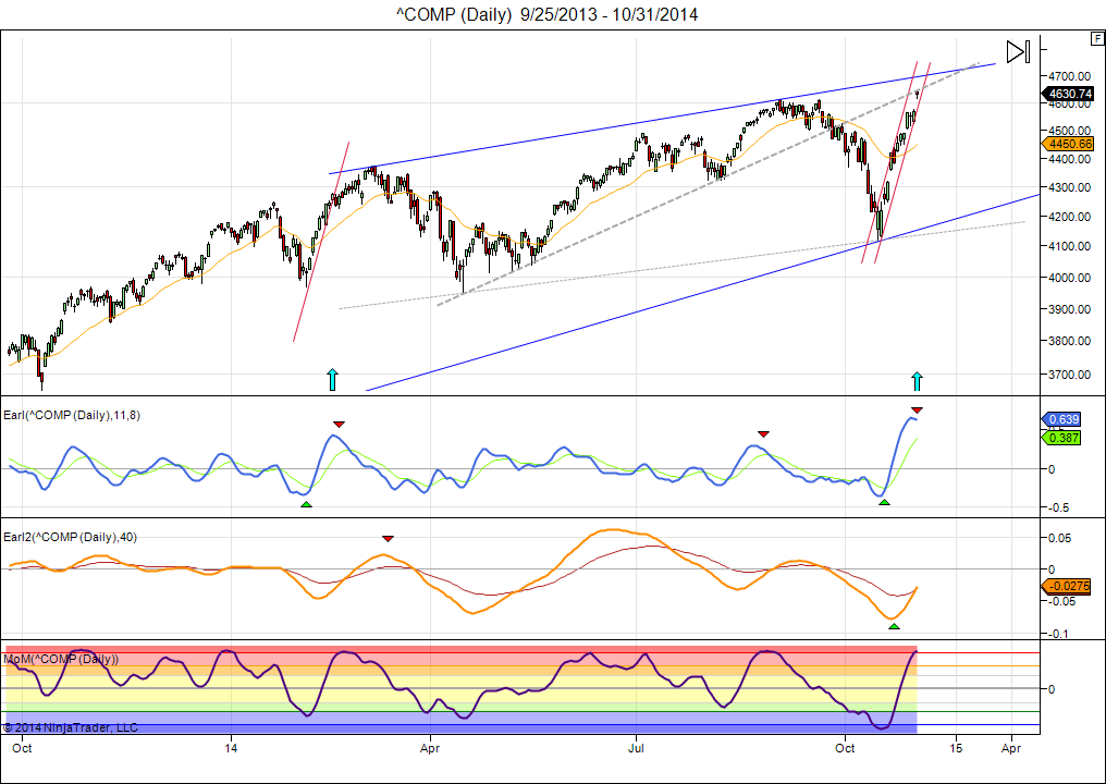 The current market situation is quite similar to last February, when the market recovered equally quickly from a sell-off. The current rate of change cannot be sustained for very long, and overhead resistance is now looming near 4650 and 4700. Technically my Earl indicator is just turning down and the MoM is reaching very overbought +8 territory. But just like in February the slower Earl2 still has a lot of room to rise. The market may hold up near current levels for a while, or it may start another leg down like it did in March-April, there is no way to tell at this point.