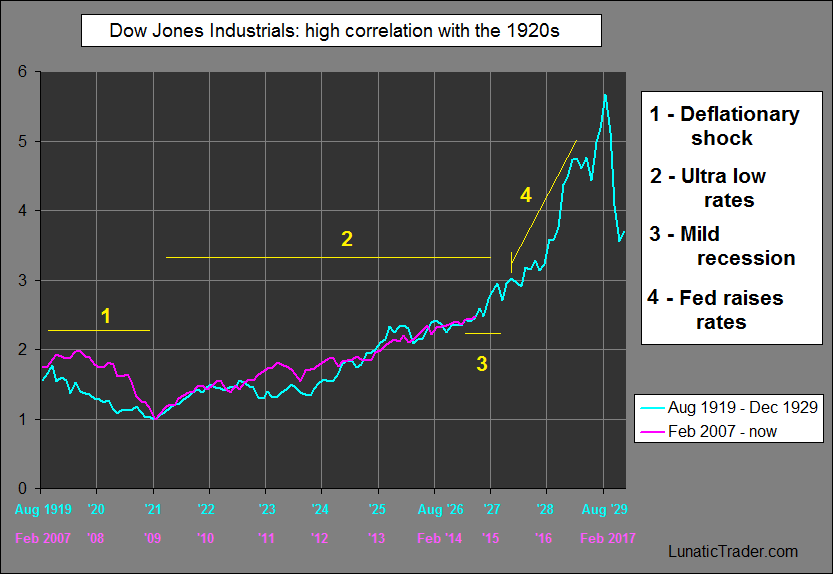 We have now come to the point where the stock market took off again. For the scenario to stay on track the Dow will have to climb to ~20000 by next spring. If the Fed sticks to the 1920s playbook then it will start raising rates in summer 2015 and that will cause the stocks to make a blow-off top over the next 12 to 18 months. Of course, that would be in a perfect universe…
