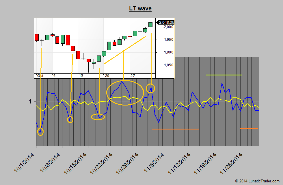 The LT wave was not perfect in October (it never is), but it signaled some downturns and correctly showed the strength in the second half of the month. For November it shows renewed weakness in the first two weeks, followed by a stronger period with a peak value around the 20th-22nd.