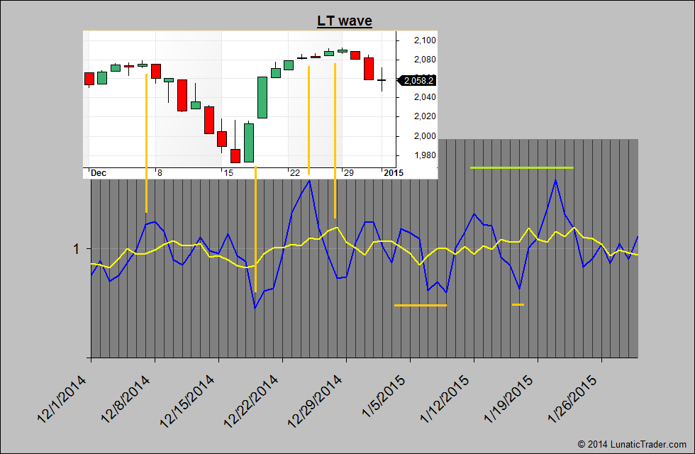 The LT wave did very well in December. The overall moves matched the expected pattern quite closely. For January the projected pattern calls for weakness until the 9th followed by a stronger period until the 23rd. This stronger period has a quick dip in the middle, around 16th-17th. The 17th is Saturday, so it may carry over into a weak opening on Monday 19th, from which market “should” recover. Last week of January is again weaker, but not overly negative.