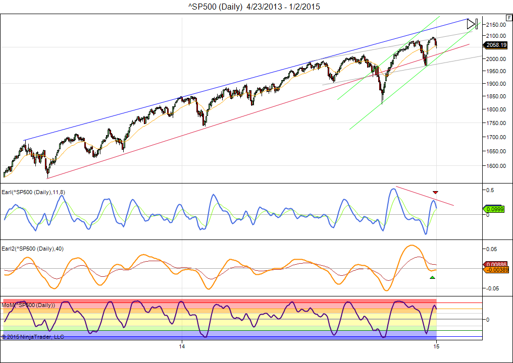 The market is starting the new year with a pullback. Moves on the first and last days of a year are generally rather meaningless. This pullback is probably testament to a bearish mood, with some investors having waited to take profits for tax reasons. We remain in a lunar red period until later this week and technically my Earl indicator is pulling back with the slower Earl2 being on neutral. We could easily retest the 2000 level and if the S&P drops even lower then more bearish scenarios will come into play. Until then this is just a slow start to the year.