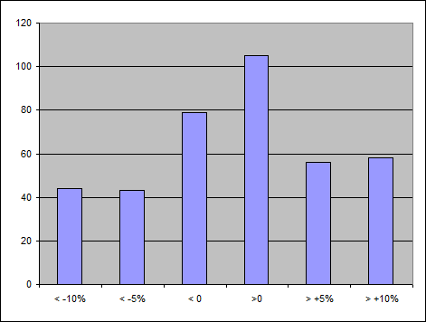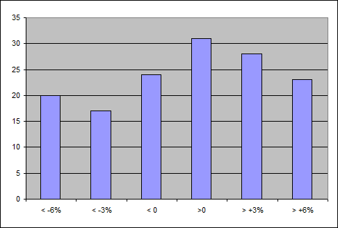 Looking where the market went after one month. In 20 cases (14%) the market was down more than 6% after 20 trading days and in 23 cases (16%) the market was up more than 6%. This chart shows all results for 20 days later: