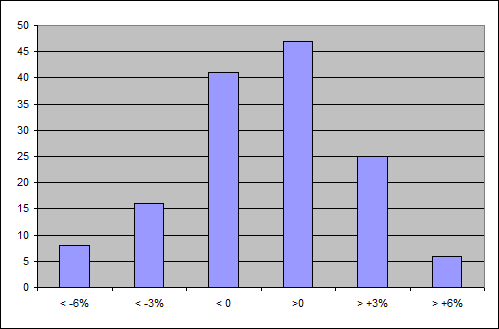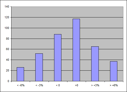 For the S&P 500 I found 143 of those days since the early 1980s. In 54.5% of the cases the market ended up being higher 5 days later, and in 57% of the cases the market was higher 20 trading days later (20 trading days is about 1 month). The average expectation is slightly positive, both after 5 and after 20 days. In 8 cases the market was down more than 6% after 5 days, and in 6 cases it was up more than 6% after 5 days. In 25 cases the S&P was up between 3 and 6% in the next 5 days, and in 47 cases the market climbed between 0 and 3%. Here is the complete distribution chart: