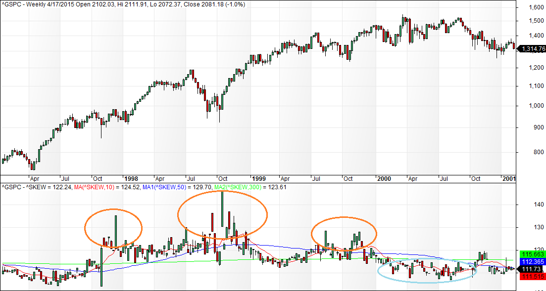 If we study the history of the SKEW index since the early 1990s we can see that concept in action. Here is a chart showing how the SKEW behaved going into the 2000 market top. (click image to enlarge it):