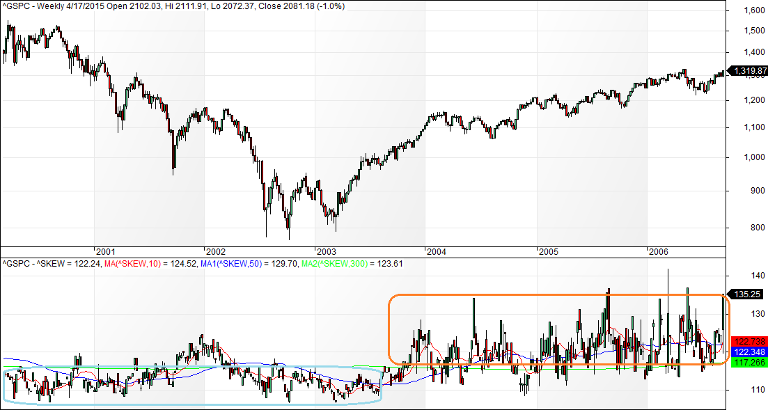 And surprisingly, the SKEW stayed below average for most of the market’s slide into the 2003 lows. People did not buy much crash insurance when it would have paid off. Then as the market recovered and kept climbing in 2003-2006, people started worrying about another crash and they bought more out of the money puts again to be on the safe side. From late 2003 until early 2007 the SKEW index stayed above average with regular spikes above 130. Image (click to enlarge):