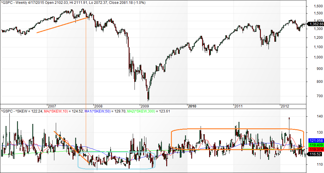 By the end of 2007 the SKEW had dropped below its historic average again, and the demand for crash insurance remained low (as evidenced by low SKEW) for most of the slide into the 2009 lows. In August 2008, right before the most dramatic part of the crash, the SKEW was even trading below 110.