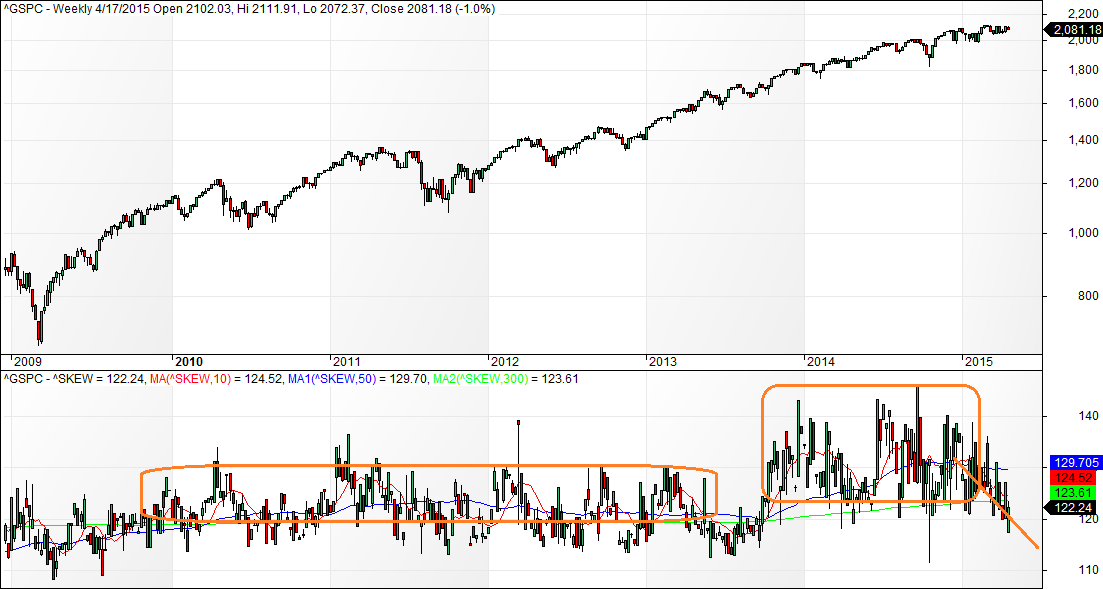 The VIX has a little brother in the SKEW index, and that one is more interesting to watch. Here is a good introduction on the SKEW. The SKEW index is calculated on the basis of far out of the money options (with average duration of about 30 days), and is specifically designed to measure perceived “tail risk”. E.g. if many investors are afraid that the market may crash, they can buy some protective put options at strike prices that are 10% below the market. Those options are usually inexpensive and in the case of a sudden drop those option can become very profitable bets. If there is a lot of demand for this kind of “crash insurance”, then the premiums of those options rise more than rest of the options spectrum, and that gets reflected in a higher SKEW index. So, basically, when the SKEW is high it tells us that a lot of crash insurance is being bought, and when the SKEW is low it means that investors are buying less insurance (for example because they feel safe that the market will not drop in the next month).
