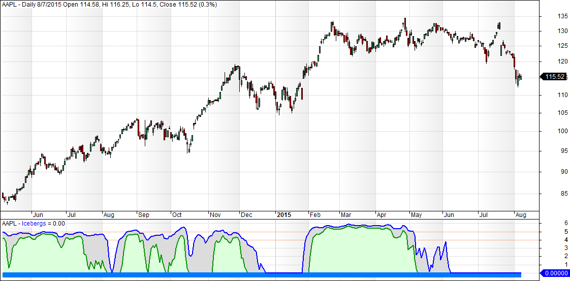 Armed with this knowledge you can read stocks in a way that is not possible otherwise. You can quickly spot “regime change” in any market, you can see if a stock is red hot (lava), dead cold (floating ice), healthy green bullish or just dead in the water. Icebergs warn for possible dangers ahead. Here are a few more examples. Apple (click image to enlarge it):