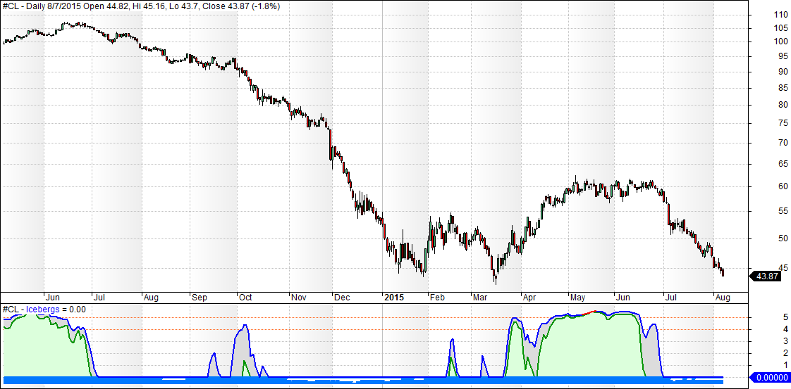I am a visual type of person and I like colors. A picture can say more than a thousand words, so I have been working on a type of stock chart that can give a better visual picture of what is going on. It is still a work in progress, but I already like the current result, so I am going to show some “iceberg charts” for the first time. Here is crude oil (click image to enlarge it):