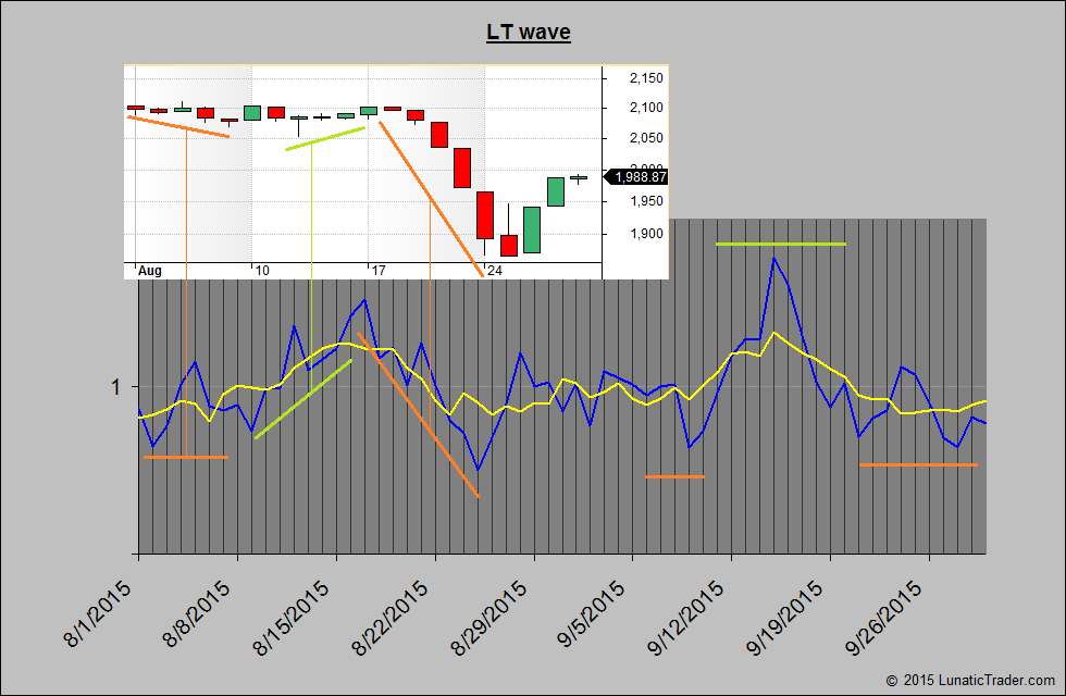 The wave did well again in August. The month started weak as expected, and projected strength into the 17th barely managed to keep the market flat. The ensuing crash bottomed on the 25th, which was the LT wave low value for the month.
