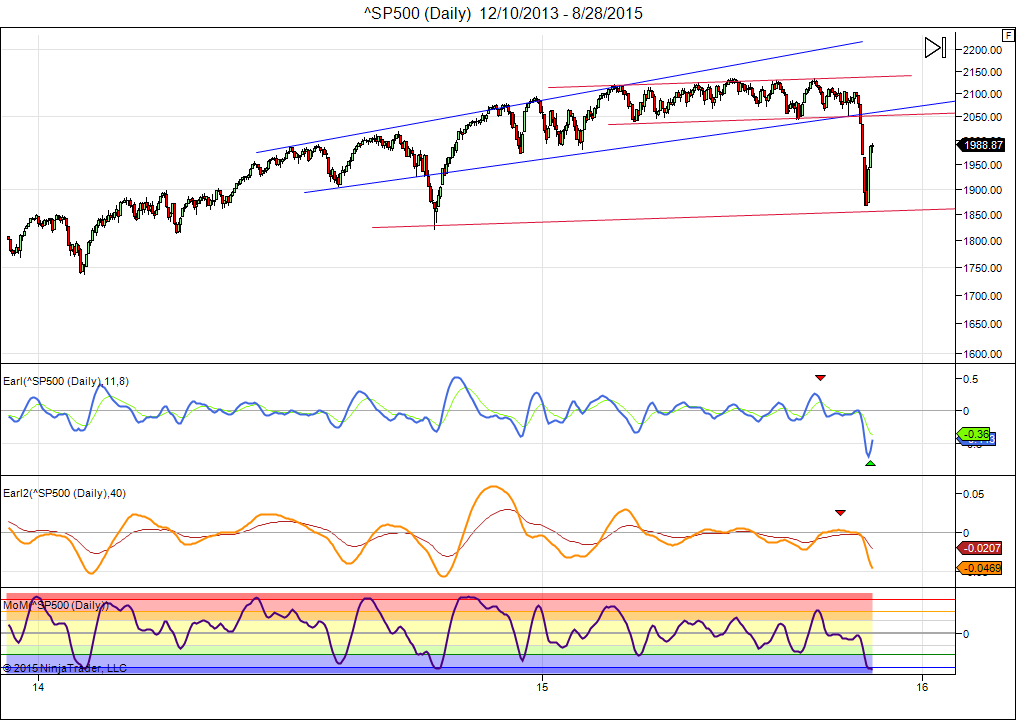 The lunar red period will end this week. The Earl indicator (blue line) has turned up from a significant bottom already. The MoM is turning up as well. The slower Earl2 (orange) line is still going down, but entering deep bottom territory. This means we could easily see a further rebound, and I think the old support levels near 2050 on the S&P will now become strong overhead resistance if the market gets there. Plenty of investors who bought stocks in the recent 6 months, and were shocked by this sudden drop, will be looking for a chance to get out near break even.