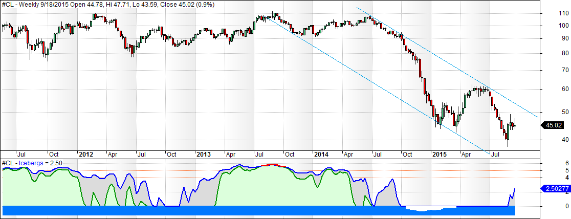 “Lava” marked a major top in August 2013. The subsequent massive drop has painted a period of “floating ice” and “open water”, and we now see the first signs of life with icy mountain appearing and going higher. This can still turn into an iceberg, which would be a bearish sign. But if some green grass appears it would be the first indication of longer term bullish energy in more than a year. A breakout above $55 would terminate the long term down trend channel, and then oil can rise to $60 and higher. I am looking for $75 to be reached in the most bullish scenario.
