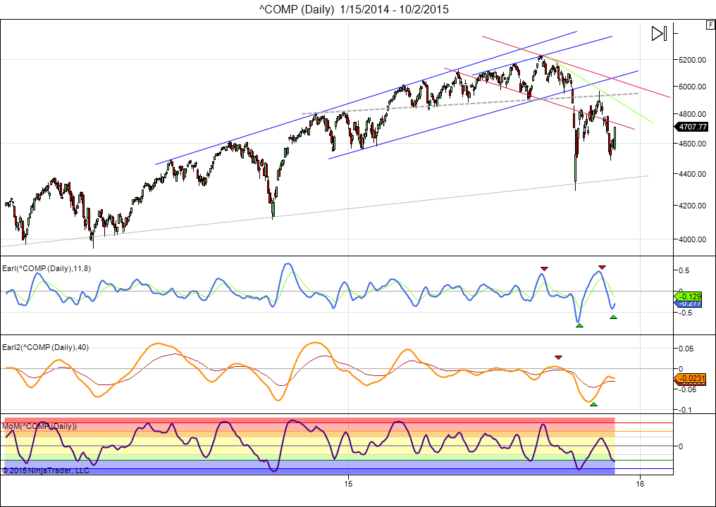 The Nasdaq appears ready to climb towards the 5000 level again. The Earl indicator (blue line) has just turned up from another major low, while the slower Earl2 (orange line) has been marking time to let the market catch up. This is a favorable setup. But a drop below the late September lows would invalidate this scenario.