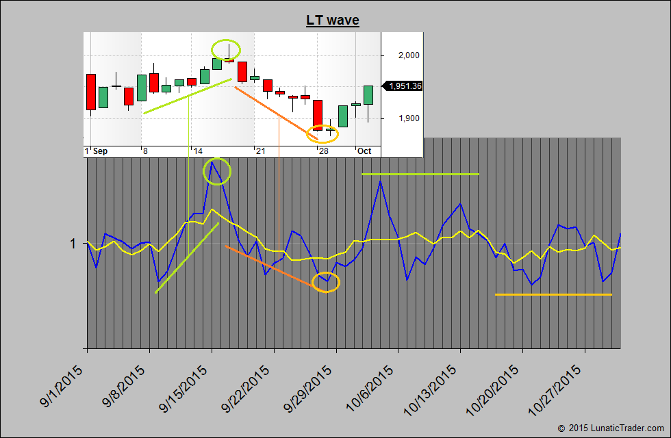 The wave did very well in September with the highs and lows coming very close to the expected dates. For October the LT wave shows a positive bias until the 15th with weakness in the second half of the month. Highest values are on the 4th and the 13th. The lowest values come on the 21st and 29th.