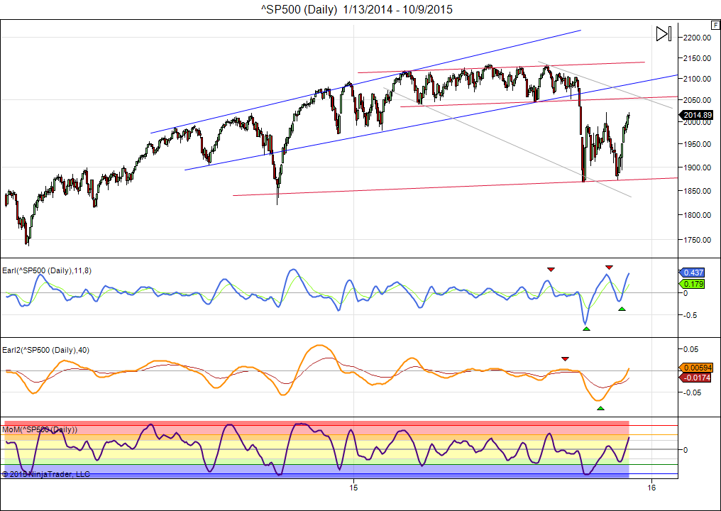 We have a nice double bottom in place and the market is clearly in search of new post-crash highs. All my indicators are climbing, but the Earl and MoM are getting quite high now. So, I think the market will start sputtering if it reaches 2050, which is major overhead resistance. It would surprise me if the S&P bursts through 2050 without a noticeable pullback. Investors who bought in the 6 months prior to the August drops did so at 2050 or higher and many of them may be waiting to get out near breakeven after being shocked by the recent declines. All that selling will have to be absorbed before the market can go higher, and that will take time imo.
