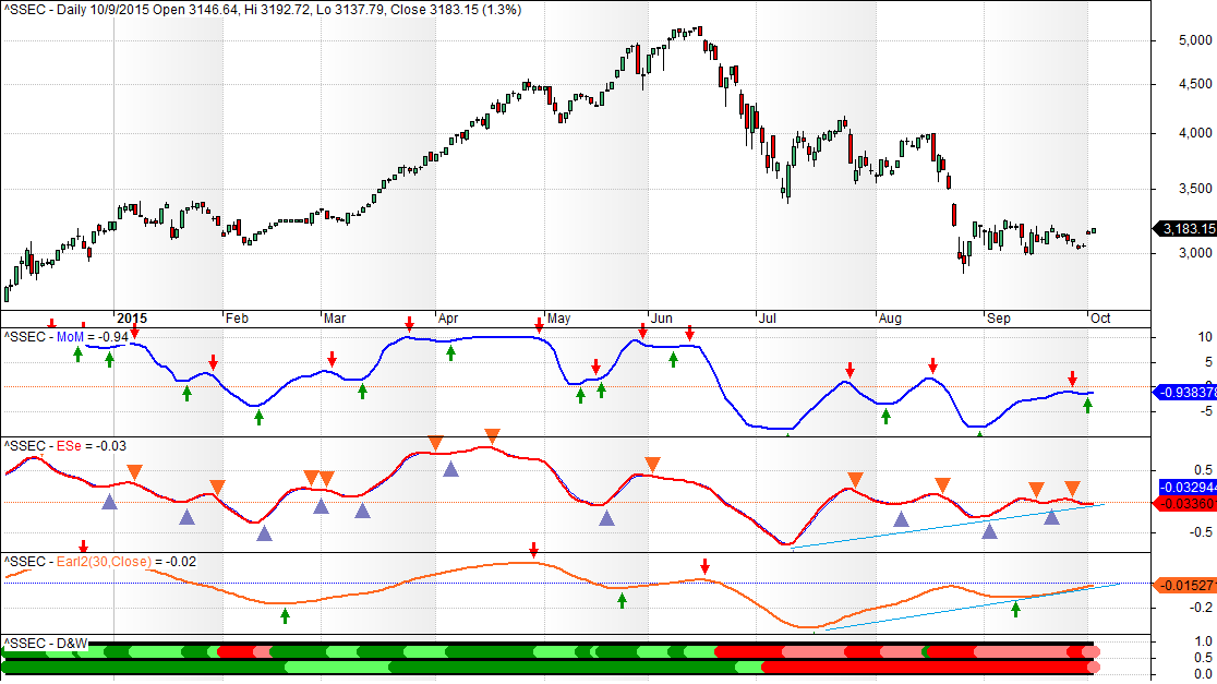 The Shanghai Composite has bottomed with major bullish divergences in Earl2 and ESe. Weekly MoM has turned up for the first time since the crash started. This sets the stage for a new climb towards 4000+.